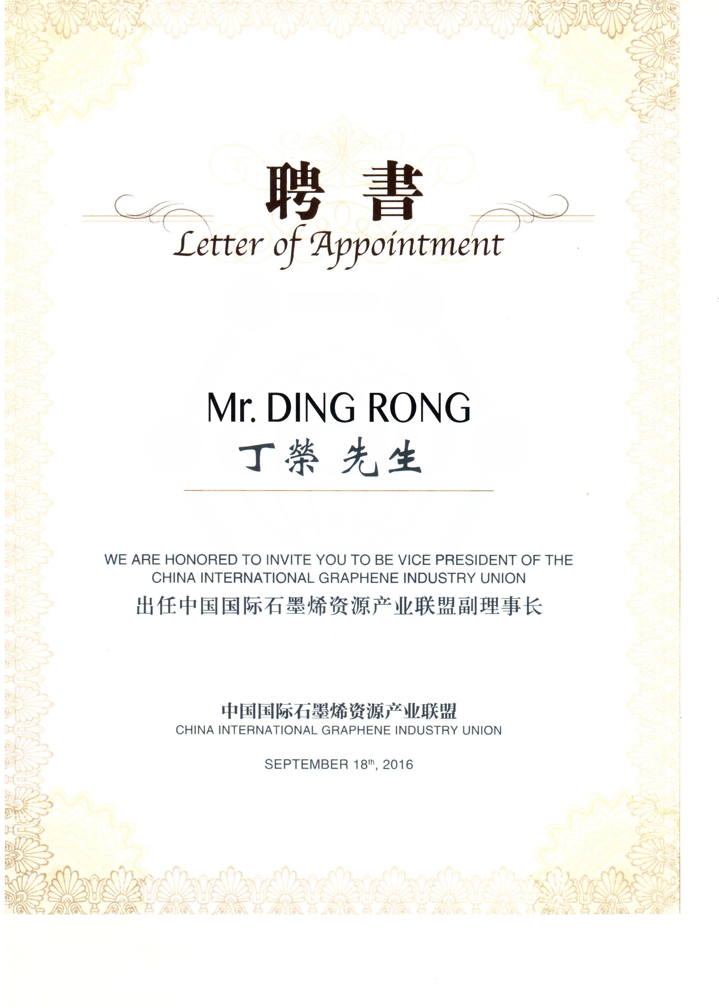 丁榮董事長出任中國國際石墨烯資源產(chǎn)業(yè)聯(lián)盟副理事長