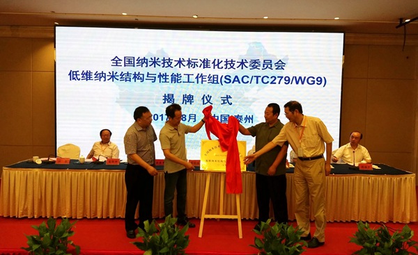 江蘇省質(zhì)量技術(shù)監(jiān)督局副局長黃運(yùn)海、泰州市人民政府副市長鄭衛(wèi)國、全國納米技術(shù)標(biāo)準(zhǔn)化技術(shù)委員會秘書長王孝平、江蘇省質(zhì)量技術(shù)監(jiān)督局標(biāo)準(zhǔn)化處處長洪淼共同為低維納米結(jié)構(gòu)與性能工作組揭牌