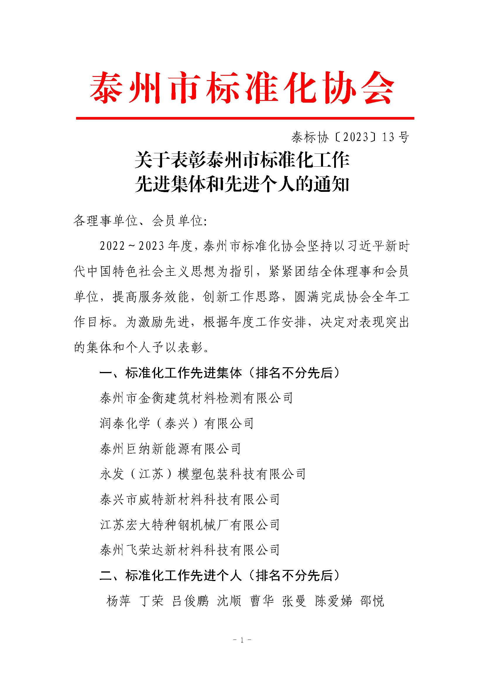近日,泰州巨納新能源有限公司和泰州飛榮達新材料科技有限公司同時榮獲2022-2023年度泰州市標準化工作先進集體,且公司有多人同時榮獲2022-2023年度泰州市標準化工作先進個人。