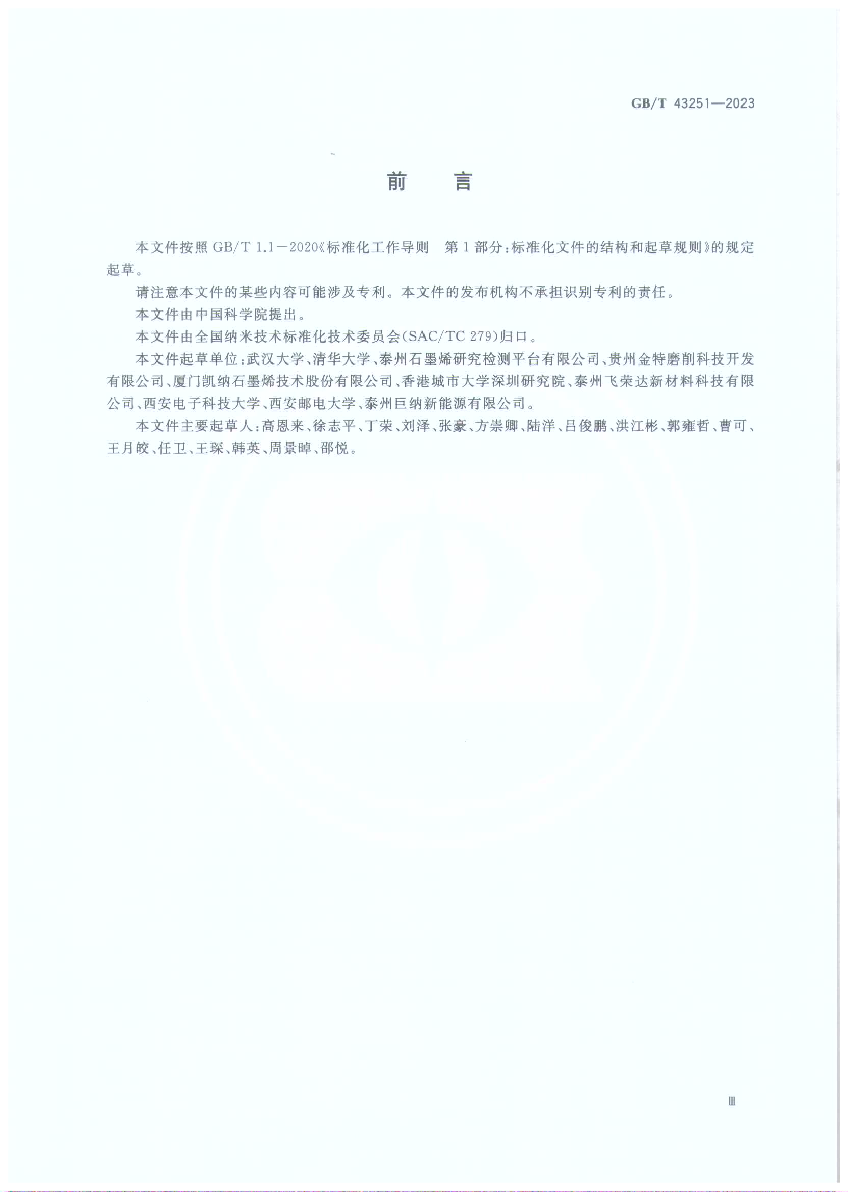 ? ? ? ?該標(biāo)準(zhǔn)項(xiàng)目提案由武漢大學(xué)高恩來副教授、清華大學(xué)徐志平教授、泰州石墨烯研究檢測平臺(tái)有限公司丁榮等提出,并于2020年正式批復(fù)立項(xiàng),隨后成立標(biāo)準(zhǔn)制定工作組。參與標(biāo)準(zhǔn)編制工作的單位包括武漢大學(xué)、清華大學(xué)、泰州石墨烯研究檢測平臺(tái)有限公司等知名科研單位和相關(guān)企業(yè),主要起草人包括高恩來、徐志平、丁榮、劉澤、張豪、方崇卿、陸洋、呂俊鵬、洪江彬、郭雍哲、曹可、王月皎、任衛(wèi)、王琛、韓英、周景晫、邵悅。