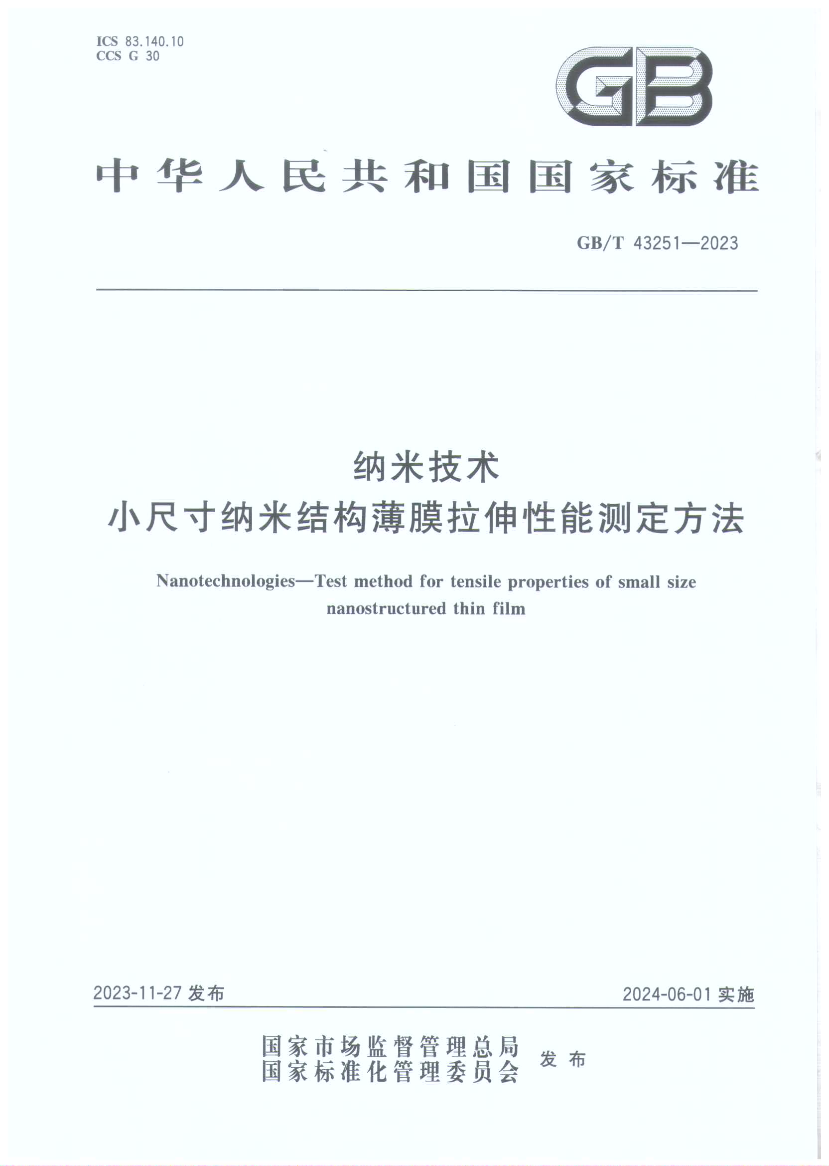 近日國家標(biāo)準(zhǔn)GB/T 43251-2023《納米技術(shù) 小尺寸納米結(jié)構(gòu)薄膜拉伸性能測定方法》正式獲批發(fā)布。泰州石墨烯研究檢測平臺(tái)為該國家標(biāo)準(zhǔn)的第三起草單位,丁榮為主要起草人(排名第三),集團(tuán)下屬飛榮達(dá)新材料、巨納新能源公司也參與了編制。