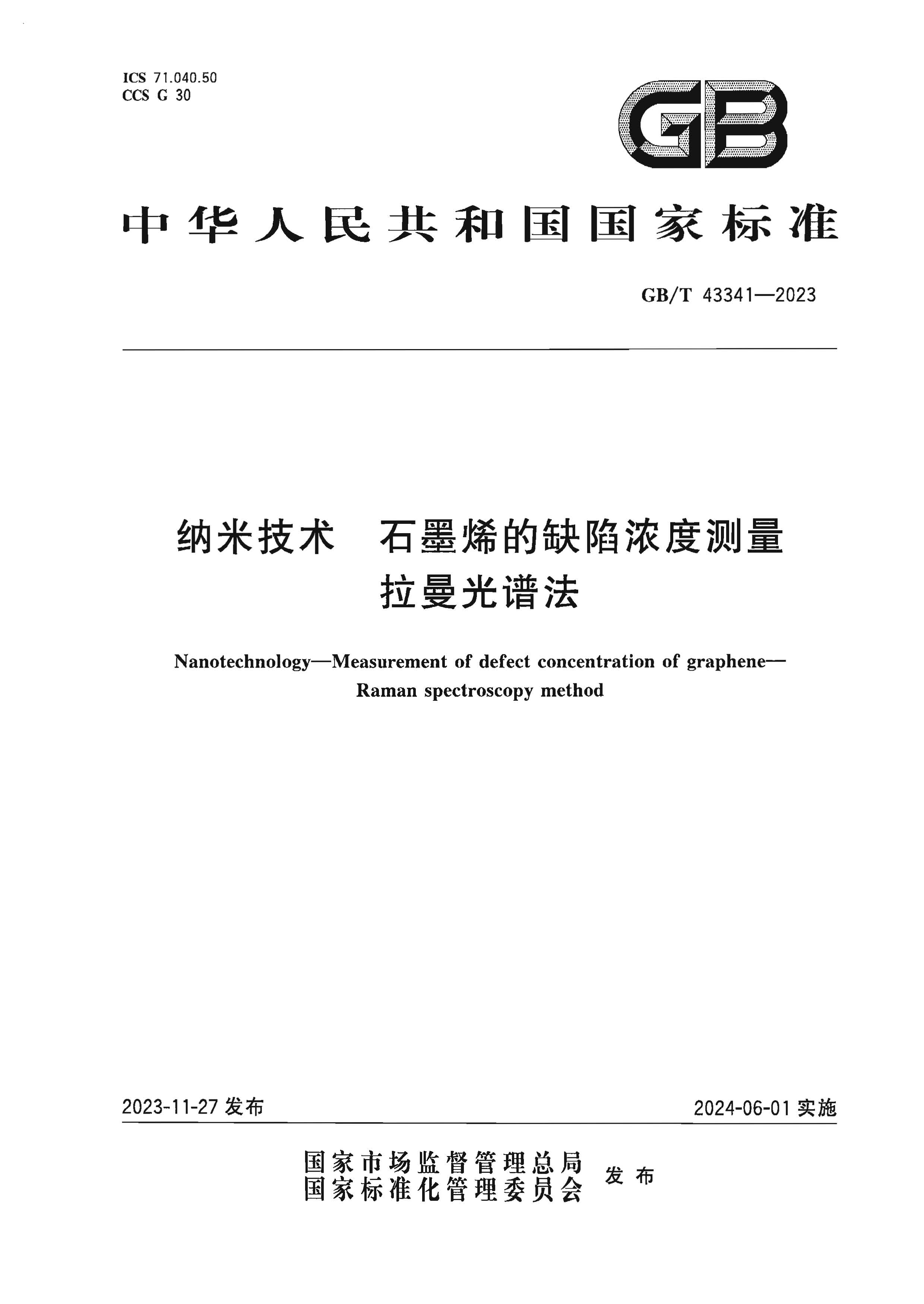 2023年11月27日,國(guó)家市場(chǎng)監(jiān)督管理總局(國(guó)家標(biāo)準(zhǔn)化管理委員會(huì))發(fā)布2023年第13號(hào)中華人民共和國(guó)國(guó)家標(biāo)準(zhǔn)公告,批準(zhǔn)由泰州石墨烯研究檢測(cè)平臺(tái)有限公司和東南大學(xué)牽頭起草的國(guó)家標(biāo)準(zhǔn)GB/T 43341-2023《納米技術(shù) 石墨烯的缺陷濃度測(cè)量 拉曼光譜法》正式發(fā)布,并將于2024年6月1日起實(shí)施。